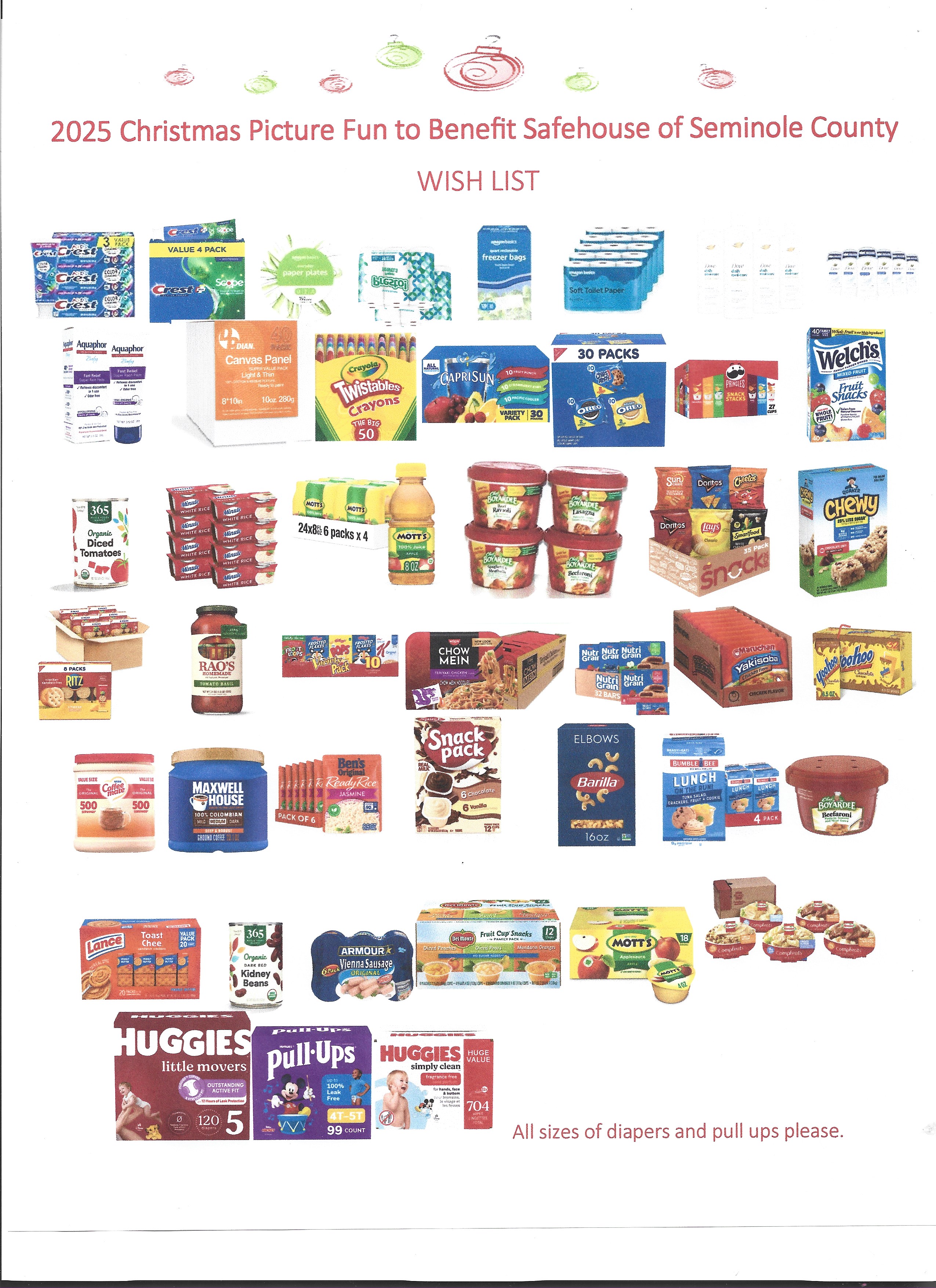 It is that time of year for some fun Christmas pictures! Schedule your appointment to come out by clicking on "barn visit" above. Please see the documents below for more information. It is fun and free. We just ask that you bring with you one item (or two+) from the wish list below to be donated to the Safehouse of Seminole County. We have some dates and times listed below. If none of those times work, let us know and we will try our best to accommodate you!